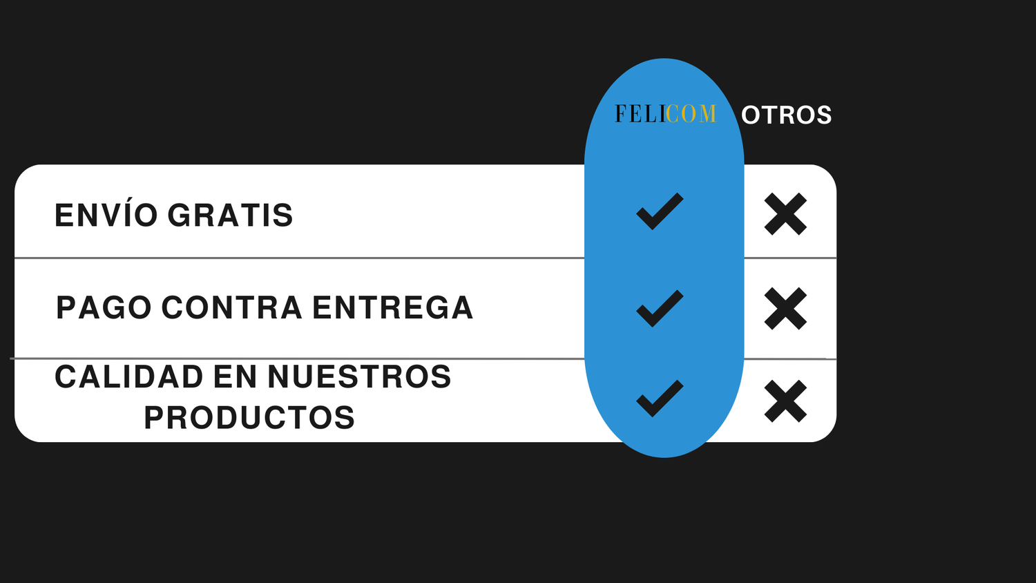En Felicom nos apasiona brindarte una experiencia de compra online segura, práctica y confiable. Nos esforzamos por ofrecerte productos de calidad, con un servicio transparente y un trato cercano, para que disfrutes de la tranquilidad de comprar desde casa con la confianza de que siempre estaremos a tu lado.